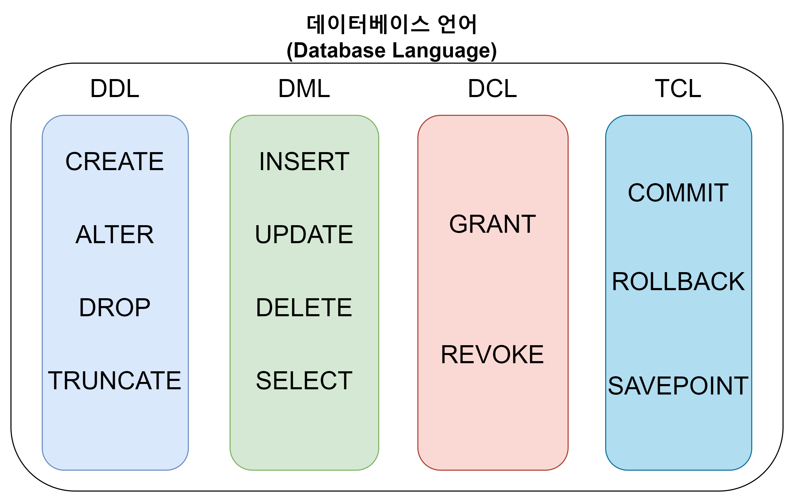 데이터베이스를 어떠한 목적을 갖고서 다루는가에 따라서 데이터 정의 언어(DDL), 데이터 조작 언어(DML), 데이터 제어 언어(DCL) 그리고 트랜잭션 제어 언어(TCL)로 구분한다.